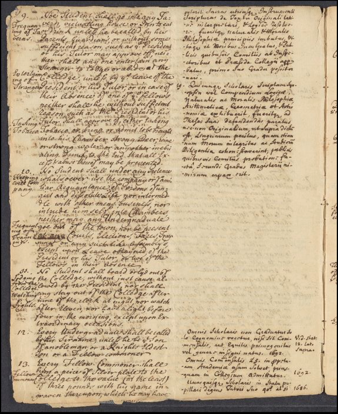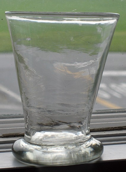 Since glassmaking was the first industry in America, glass artifacts are able to reveal many clues about early Americans’ daily lives, social hierarchy, and the beginnings of Harvard. This glass shard was once a part of late 18th century tavern glass, often referred to as a “thumper”. In a 18th century Colonial American tavern, or an “ordinary” as it was referenced in Puritan Massachusetts, the thumper was filled with varying alcohols ranging from beers and ciders to wines and mixed drinks; however, rum was the staple of every tavern since it was a liquor that was unique to the colonies. Although one of the primary functions of the tavern was to carry on the traditions of British drinking, the early taverns surrounding Harvard had stricter practices on drinking and drunkenness was strongly looked down upon with the dominating Puritan culture of the time. Drinking out of this piece of clear flint glass with a grey cast, members of each social and economic class were able to engage in discussion and form a community in a Puritan Massachusetts ordinary, although some communities did not welcome Native Americans or African Americans. The 18th century men of Harvard could often be found at the tavern on Dunster Street discussing politics, their academics, or the latest gossip going around the College. Although it is a small piece of flint glass, this artifact signifies a community formed within an ordinary that was made up of differing social classes and that allowed discussion of politics, society, and travel to prosper.