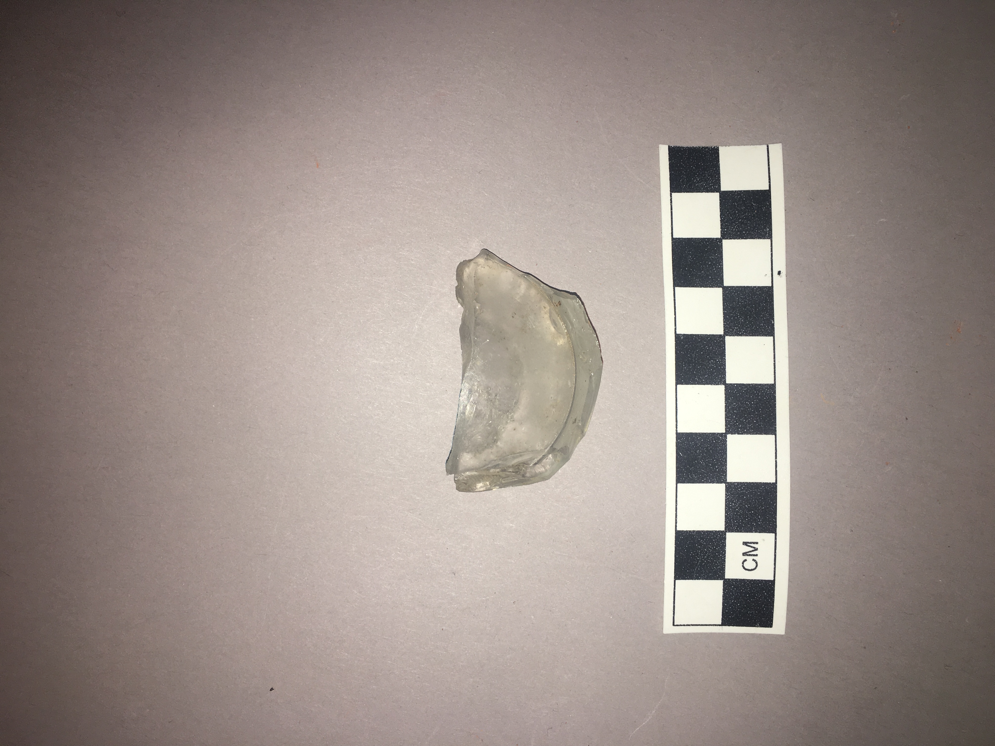 Object is a fragment of a tavern glass. It is clear, but has a grey cast and is smooth to the touch. The rim of its bottle is circular and appears to be a part of a larger drinking vessel. The glass also appears to be uneven, giving clues that it was handblown.