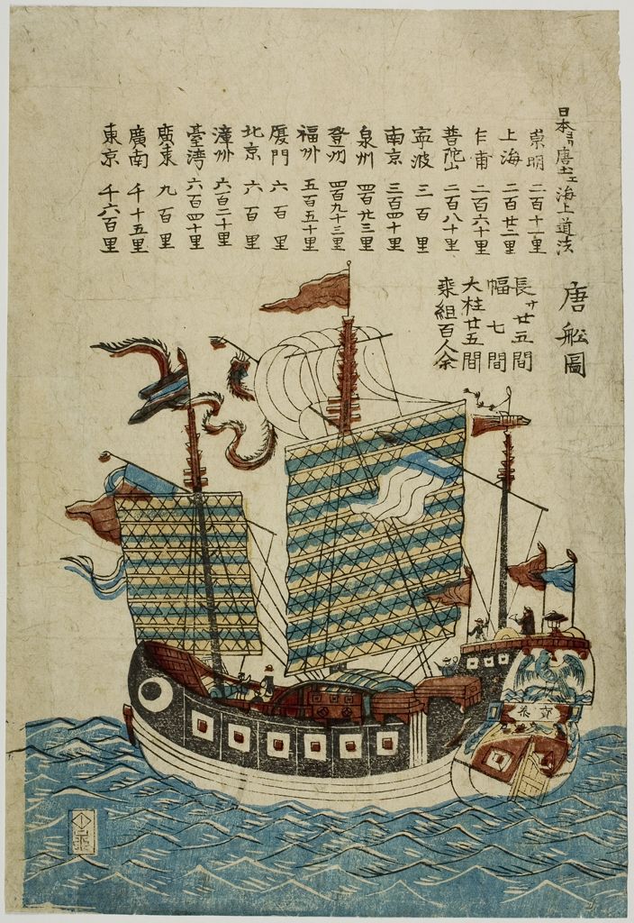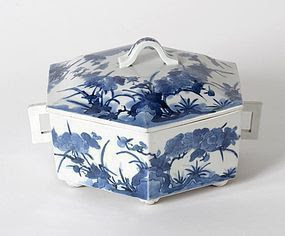 Blue and white, flat, triangular piece of Chinese porcelain. Slightly curved on the tip opposite of the design. Thickness increases towards this tip.