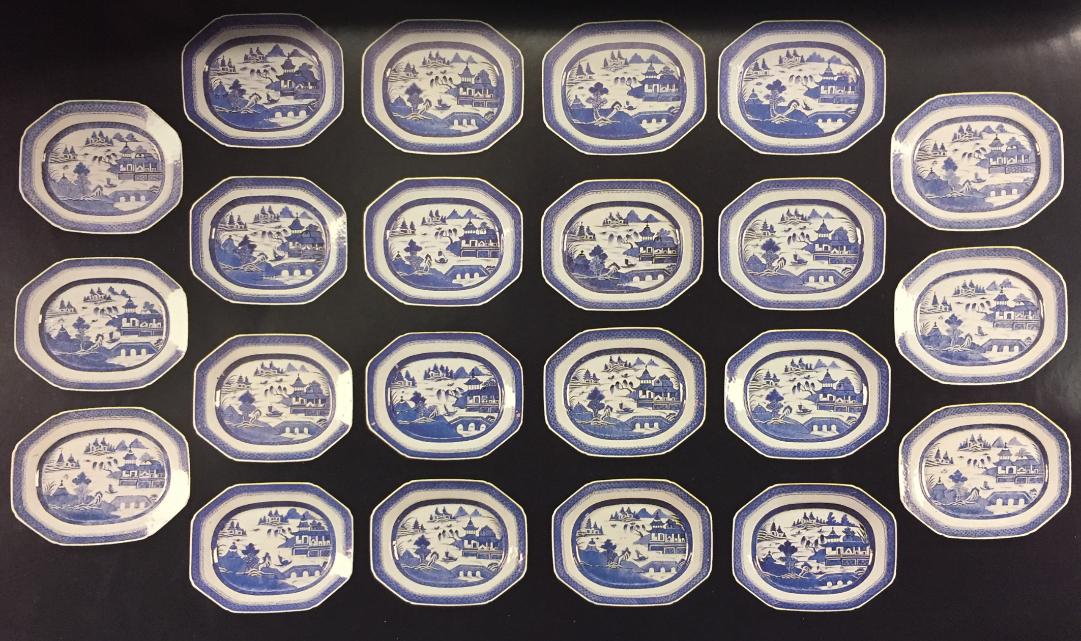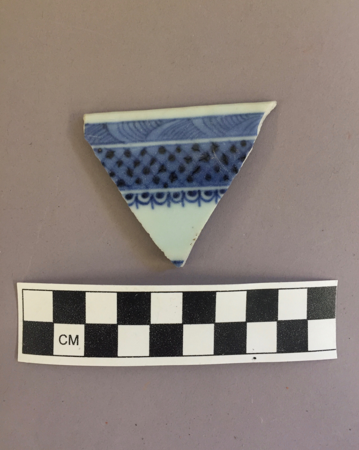 Triangular piece of porcelain with a blue and white hand-painted degraded spear and dot design