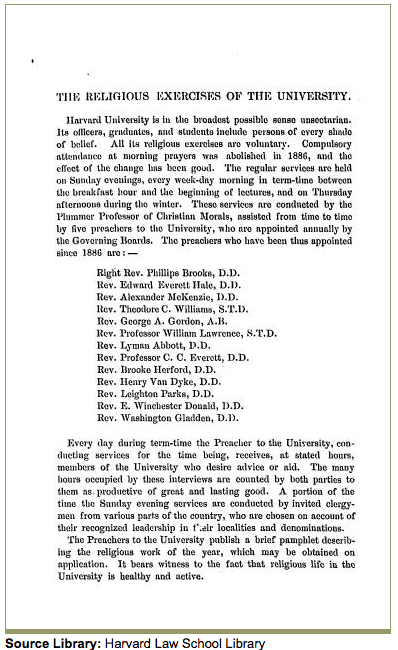 In addition to more lenient rules on alcohol, in 1886, Harvard abolished the required Morning Prayer and made the practice of religion optional. This is a clear indication that the administration became less religious in the 19th century. There are also pictures of dining halls in the early 20th century at Harvard with tumblers lining the tables and a drawing of a dining hall in the early 19th century with no tumblers in sight. These both confirm the notion that Harvard progressively became more secular near the end of the 19th century.
