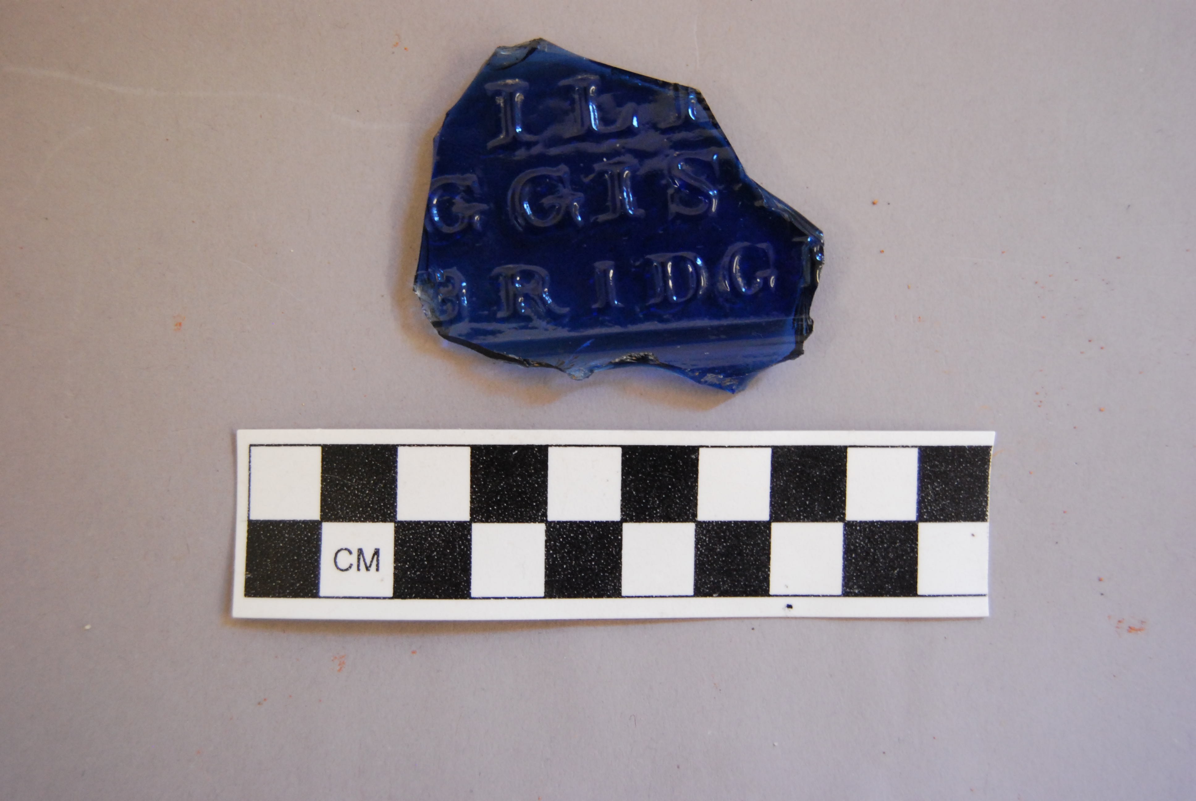 Mold-blown cobalt blue glass, letters on one side as follows: [...]ILE[...] / [...]GGIS[...] / [...]BRIDGE[...]. Concave letters on one side indicate hand-blowing.