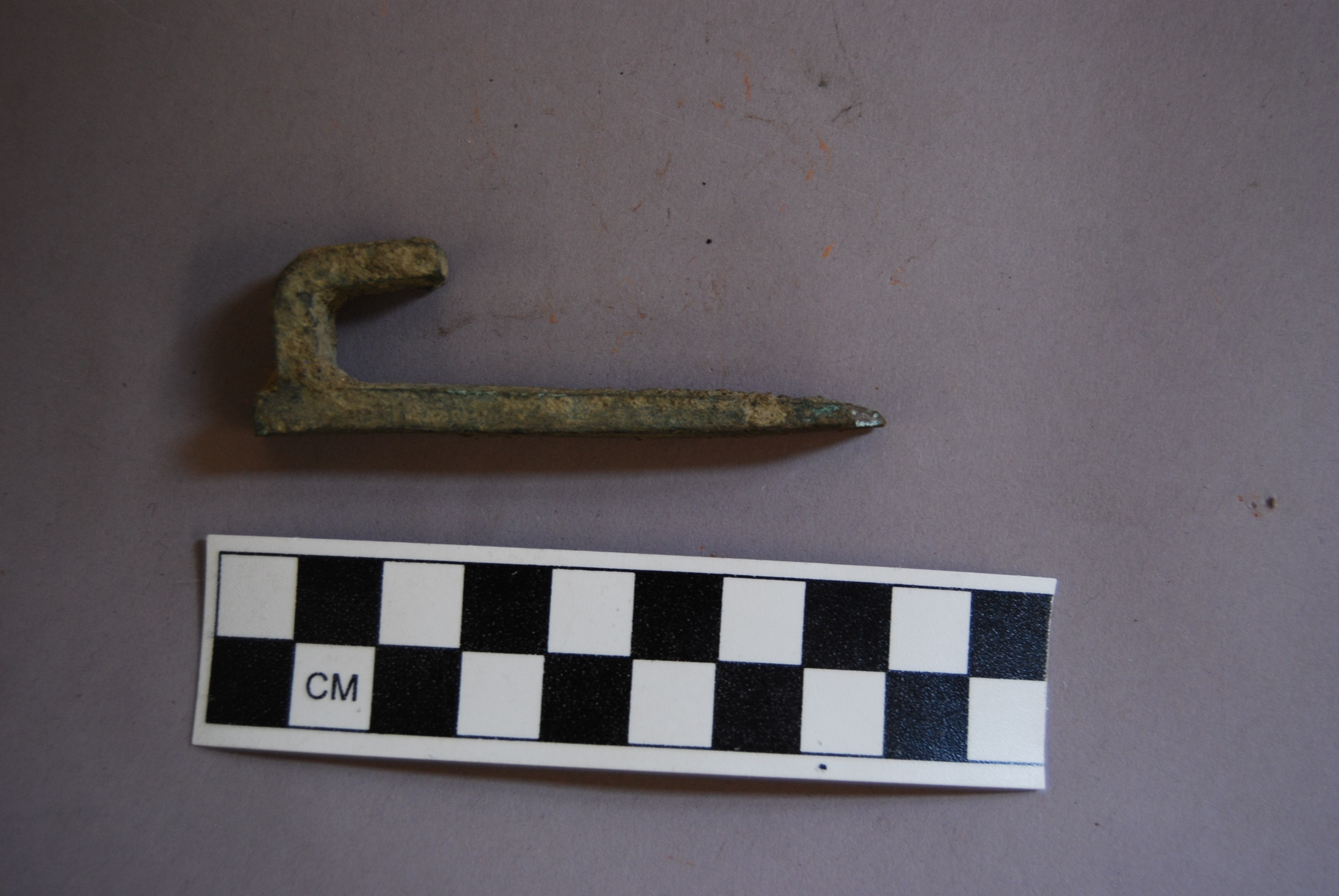 This is most likely a window hook or shutter hook. It is possible that it is hardware from a door or other fixture. It appears to be made of brass and based on the materials found with it and its presence in Level 2, it is likely from the 19th century.