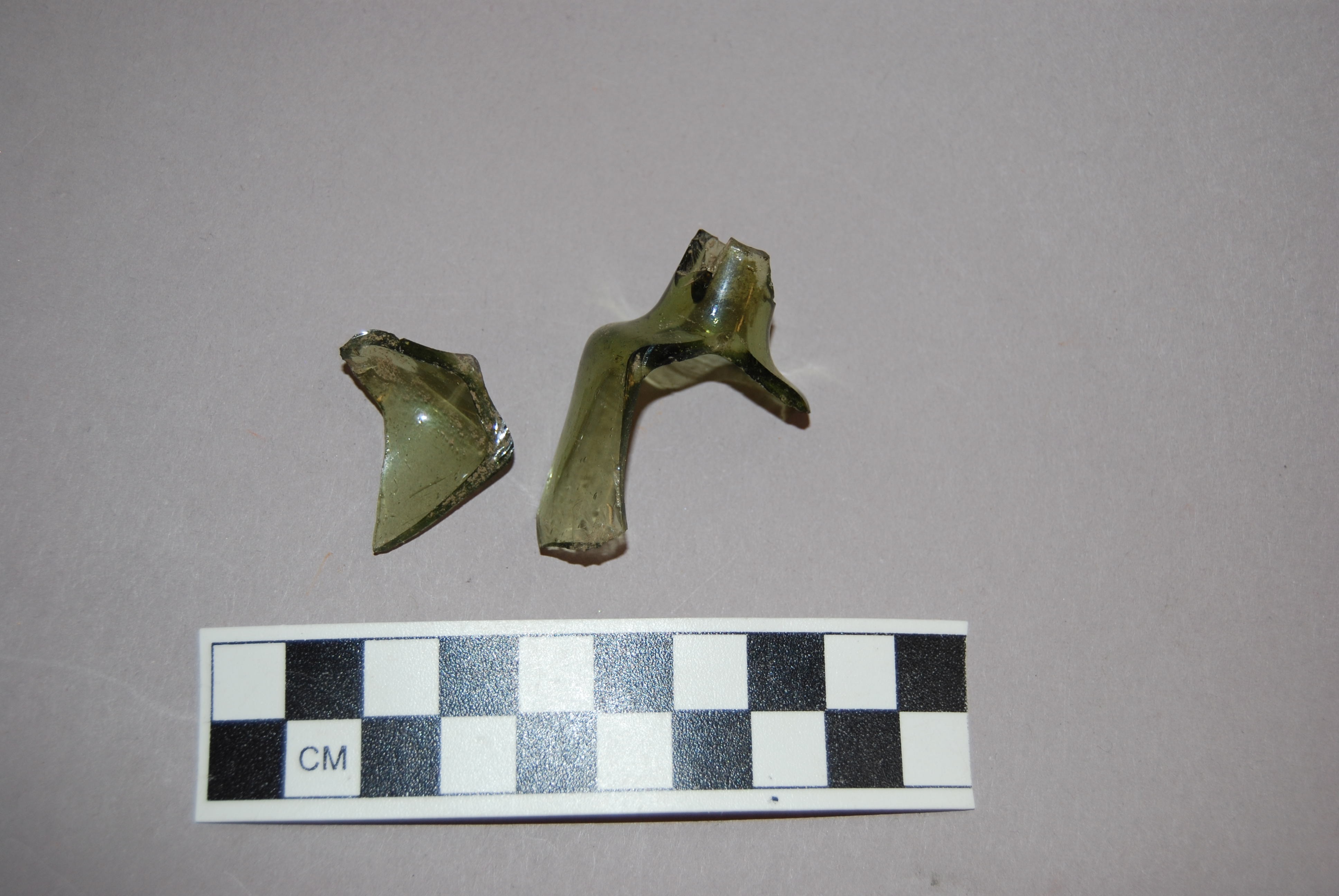 Two fragments of green, medium-thickness 18th century pharmaceutical glass. The pieces fit together and are smooth to the touch. One piece is part of the short neck and the other is part of the body of the glass. The glass also appears to be uneven, giving clues that it was handblown.