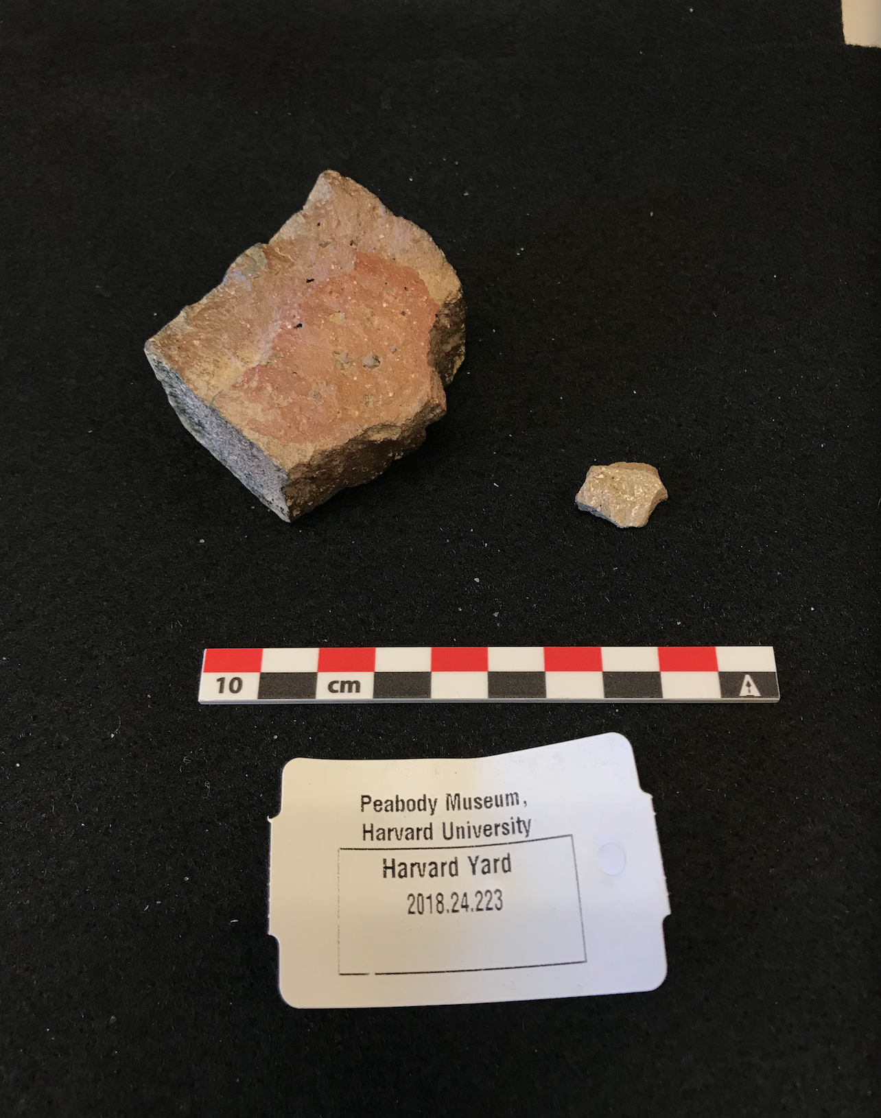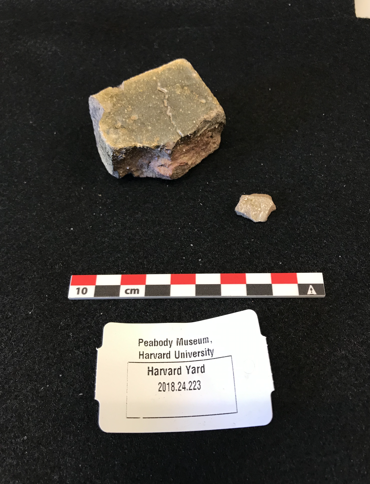This specimen displays clinkers’ characteristic glossy exterior and dark body (Balme 2009, 378). Since clinkers were “eliminated” as production improved in the late 19th century (Akthar 2013, 3) and this artifact was discovered alongside a 17th century roof tile in Level 1, which suggests mixing occurred, it is likely that the brick dates to an earlier period. It may have adorned Harvard’s Indian College or the chimney of the 17th century Old College building (Davis 1890, 16), for which a foundation trench was discovered nearby. Alternatively, it might date to a later structure, like the old Harvard Hall building, which burnt down in 1764 (Saved 2001).