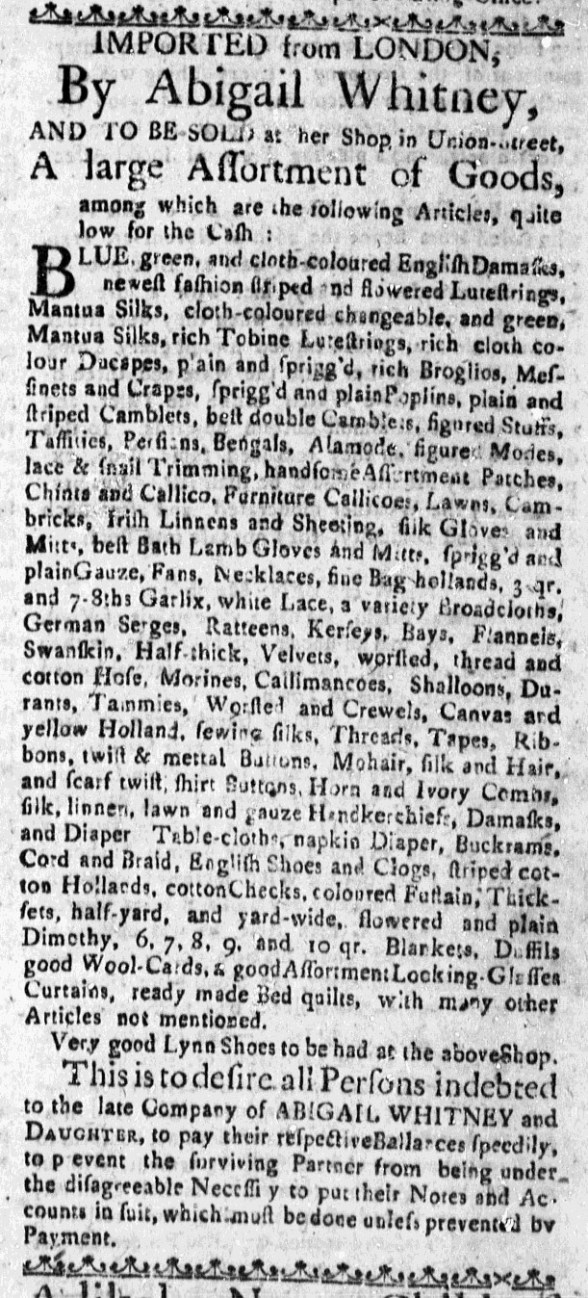 1768 “Imported from London, By Abigail Whitney.” Massachusetts Gazette Extraordinary, March 31.