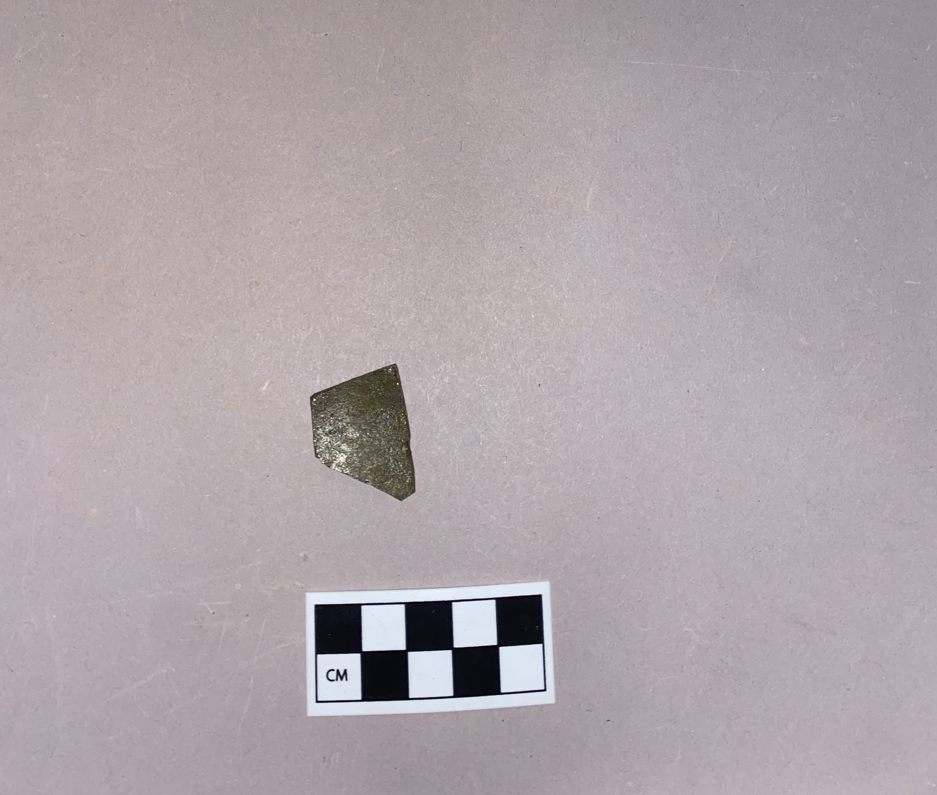 Slightly curved olive-colored glass fragment, likely from wine bottle.