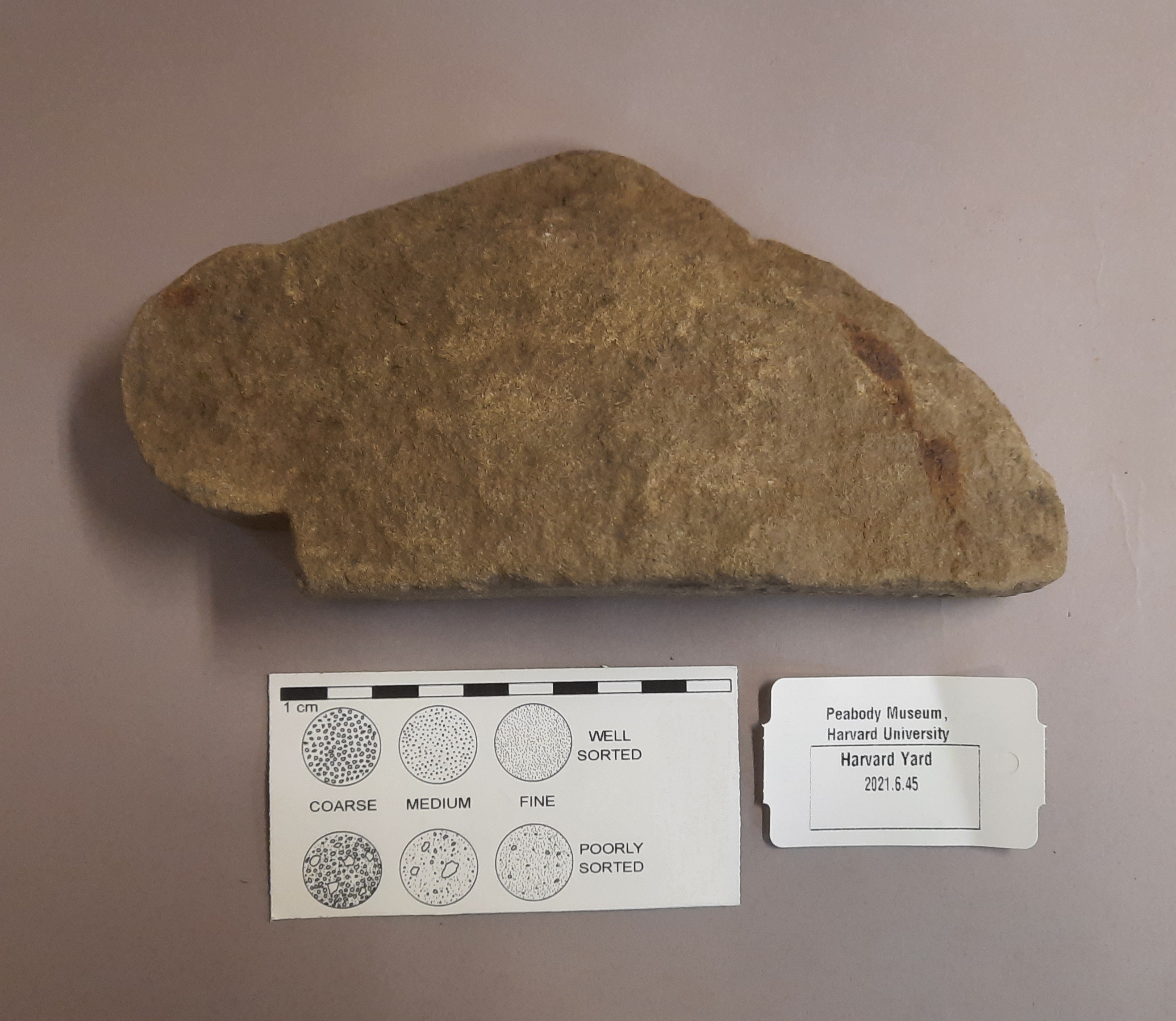 Carved on one side in the shape of a spade, the majority of the stone’s other half is unaltered. Based on the curve of the stone, it is clear that there was never enough material to replicate the spade design on the right half. The left side was worked with care, with minute, rough bumps along the carved curve. The back and base of the feature have straight and diagonal lines chiseled into it, for the purpose of using mortar to attach the ornament to a building. The brown stain is the result of a rusty nail that was found on top of the ornament.