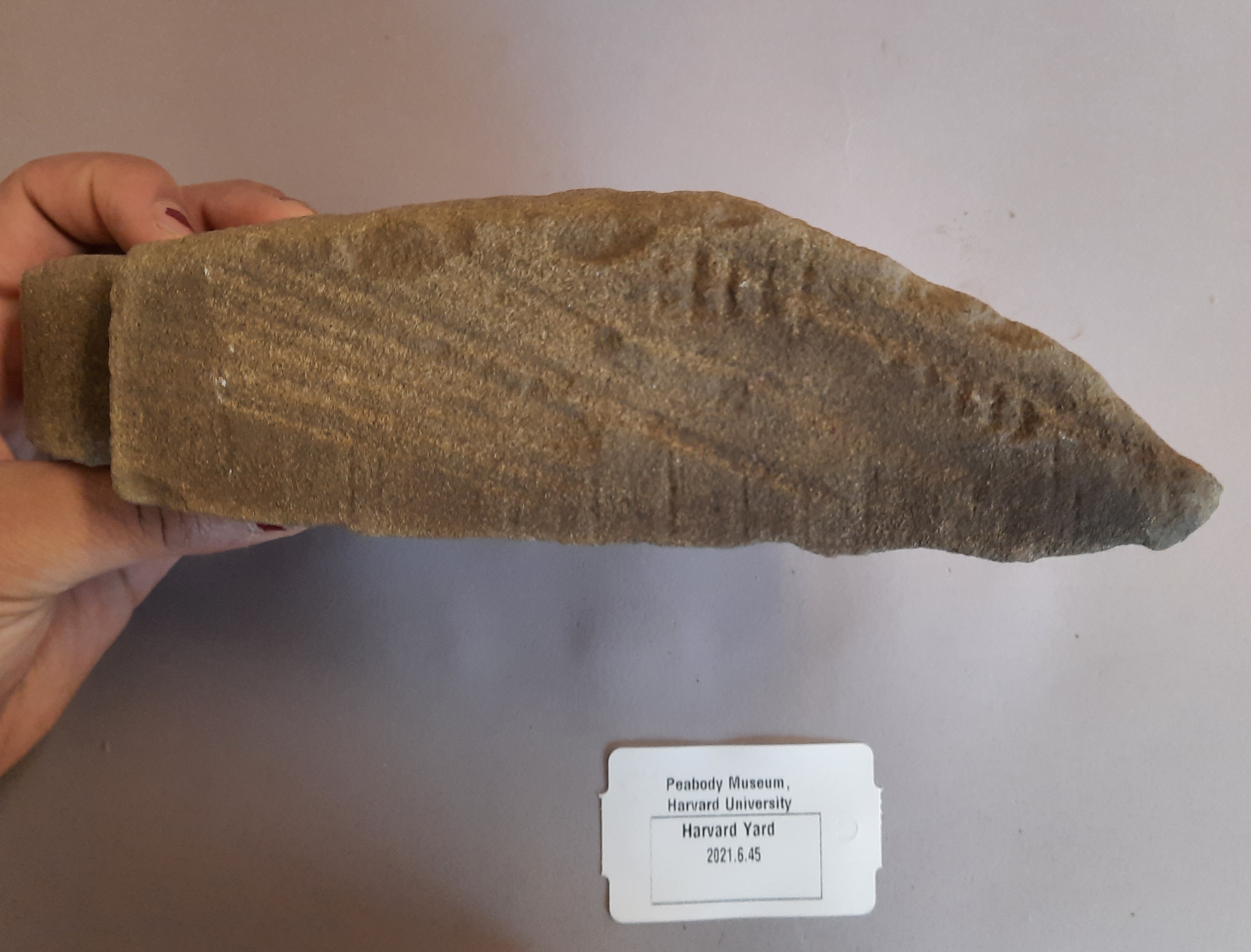 While Harvard was in the process of constructing many of the dormitories of Harvard Yard, there was likely leftover or inutile stone around the site. A construction worker may have picked up a discarded stone, and set to work on carving it. Given its shape, the ornament could never have been completed, but its being made anyways may have been to alleviate boredom or to practice the technique of making such an ornament for another project. When the worker abandoned the stone, it was discarded in the construction debris area, where it was uncovered in 2021. Stone decorations like this were used to adorn buildings, similar to the foliate stone carvings of Harvard Yard’s Matthews Hall, pictured above.