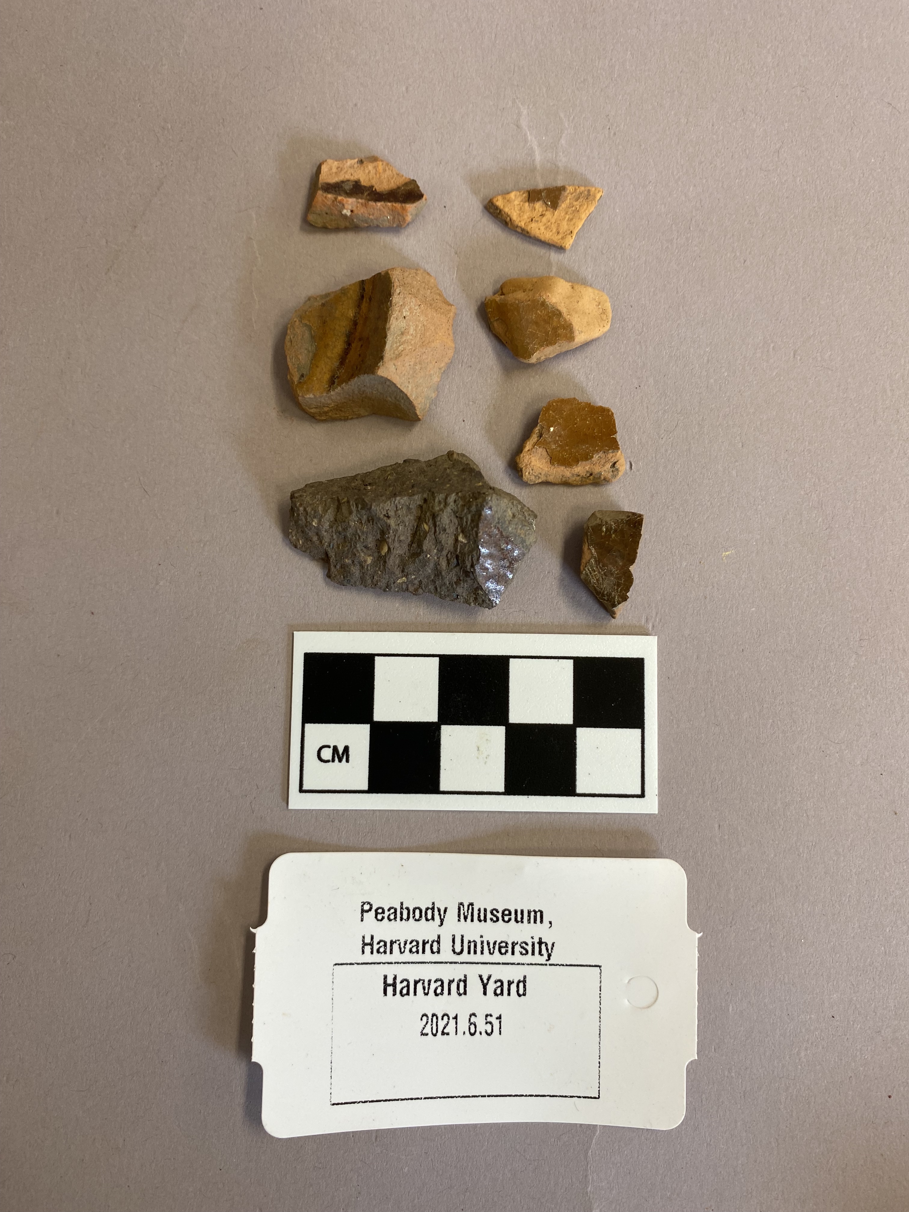 7 sherds of lead glazed earthen ware of varying body and glaze colors. One has a brown body and the others have red bodies. The brown body has brown glaze and the red bodies have light brown/tan glaze.