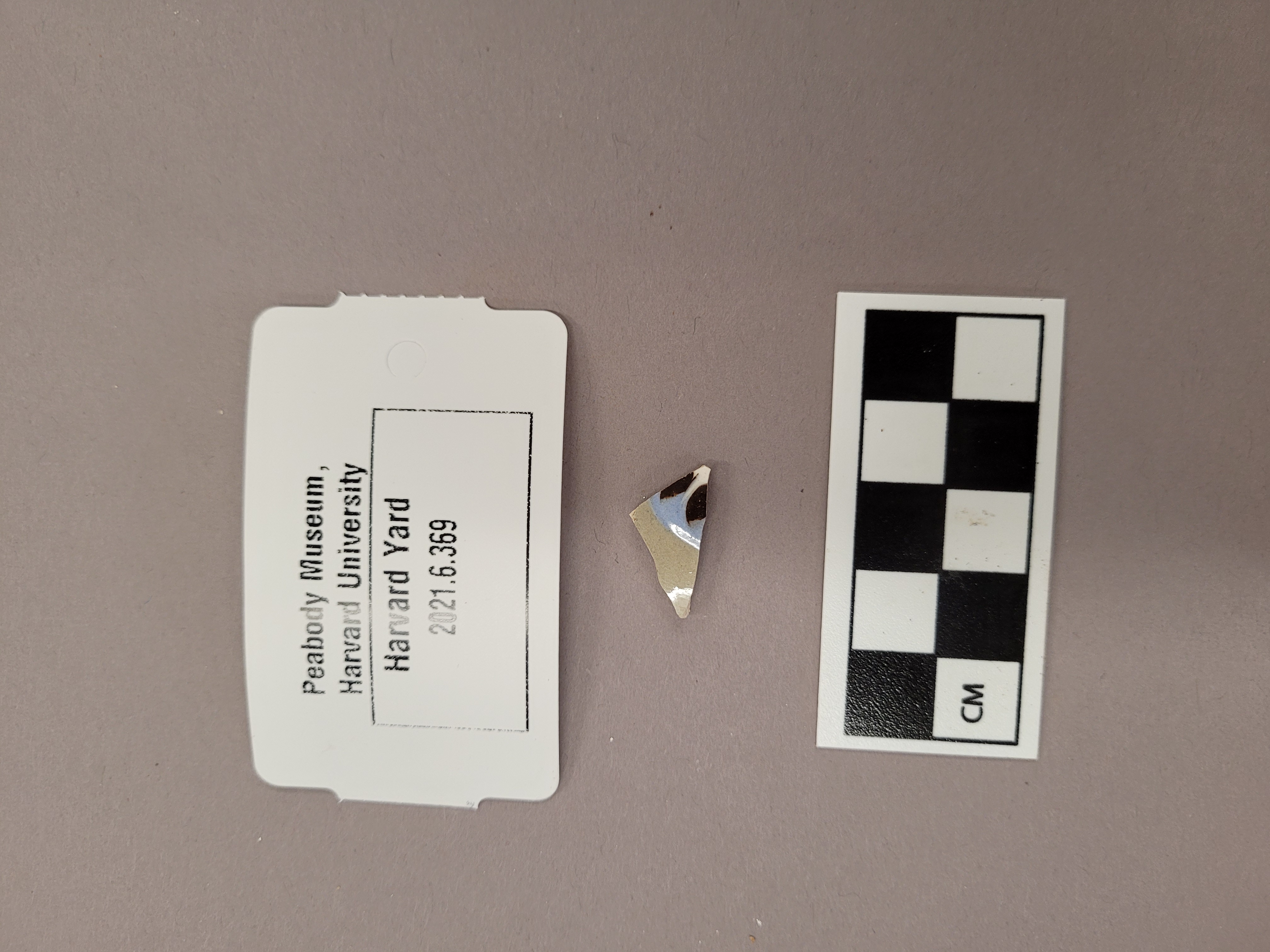 slightly curved ceramic sherd. Inside is white glazed, outside is greenish grey background with light blue, brown, and white design. multichambered slip