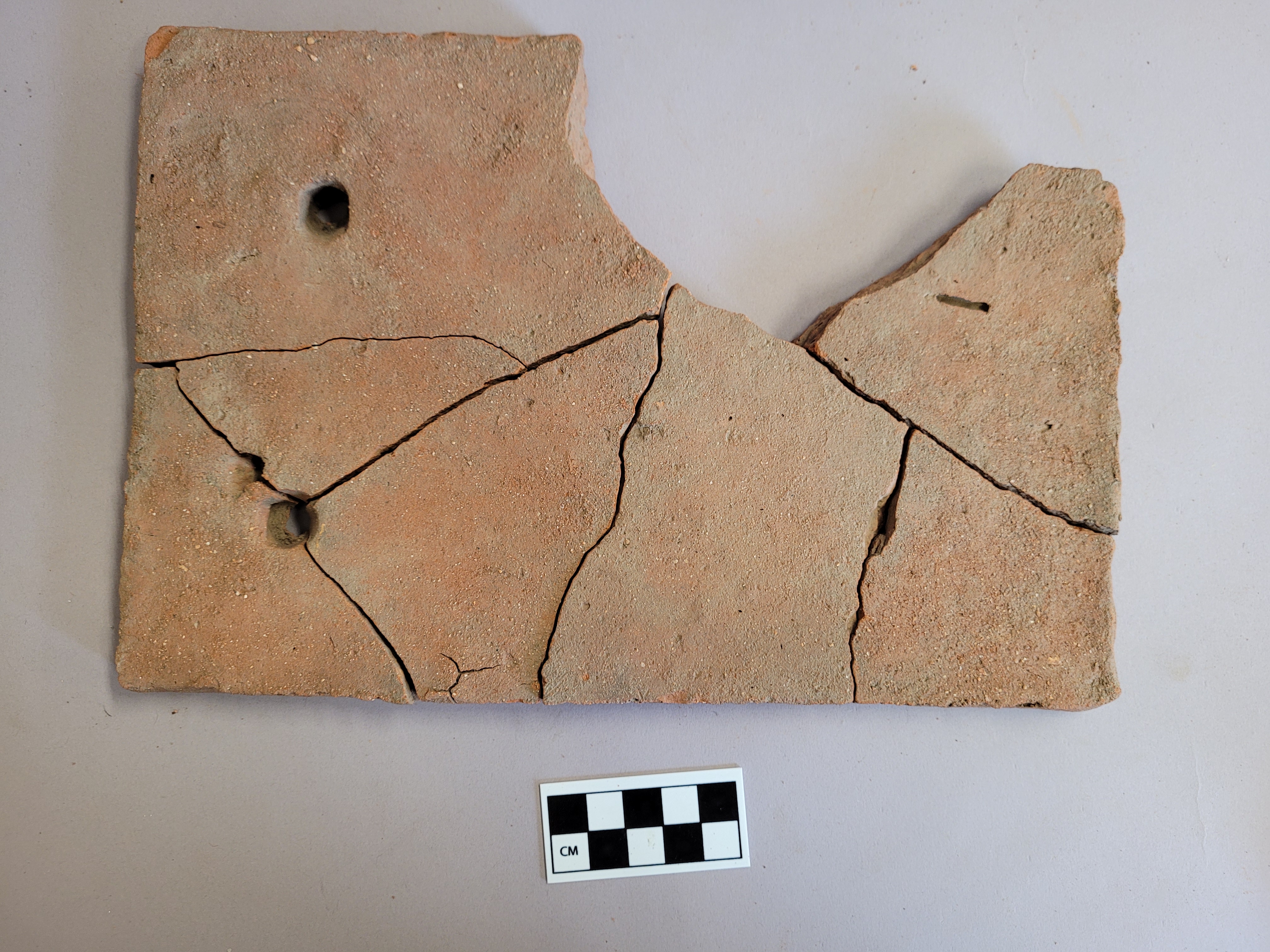 reconstructed roof tile from 7 pieces. Has two (and potentially a third attempt) nail holes. rectangular