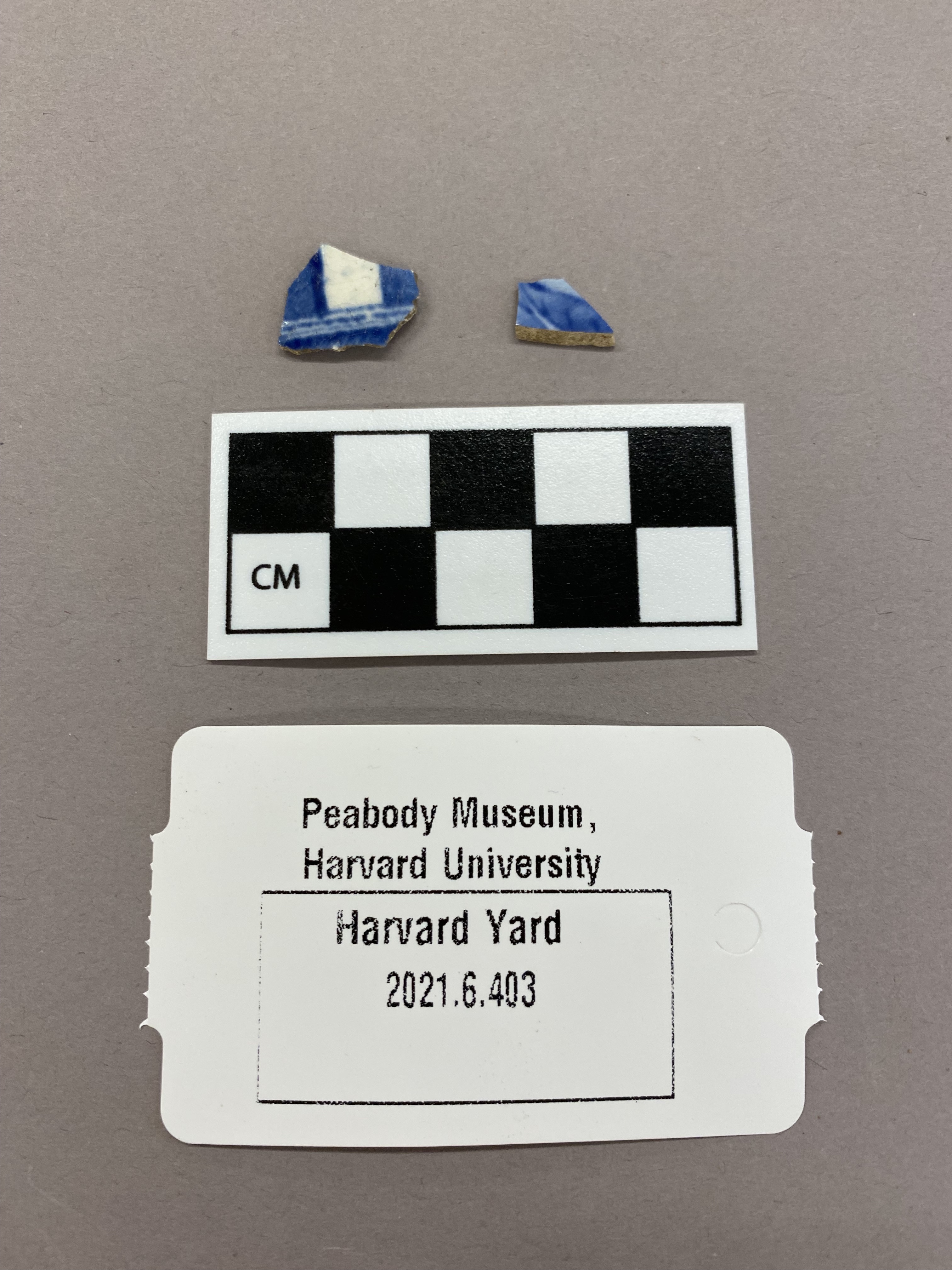 Two sherds of transfer printed pearlware. Both sherds are white and cobalt blue.