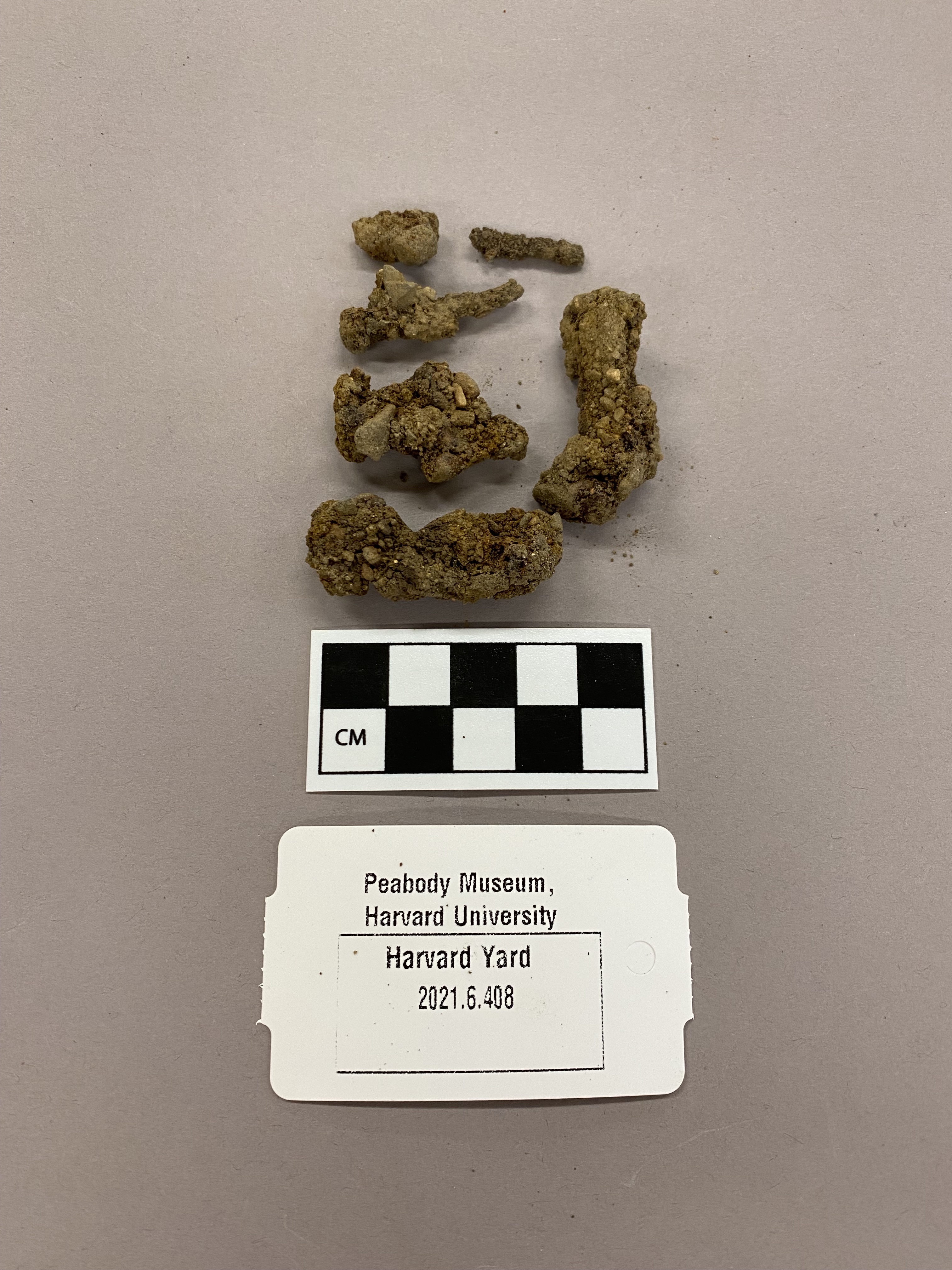 All of the pieces are heavily rusted. Two of the pieces are most likely parts of nails. The other four pieces are identifiable.