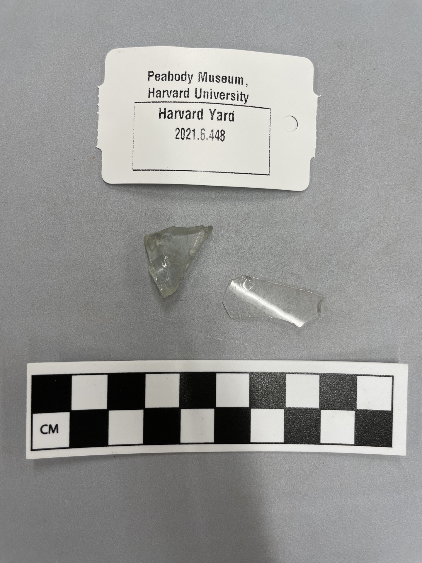 2 fragments of colorless bottle glass, one fairly thick and one fairly thin