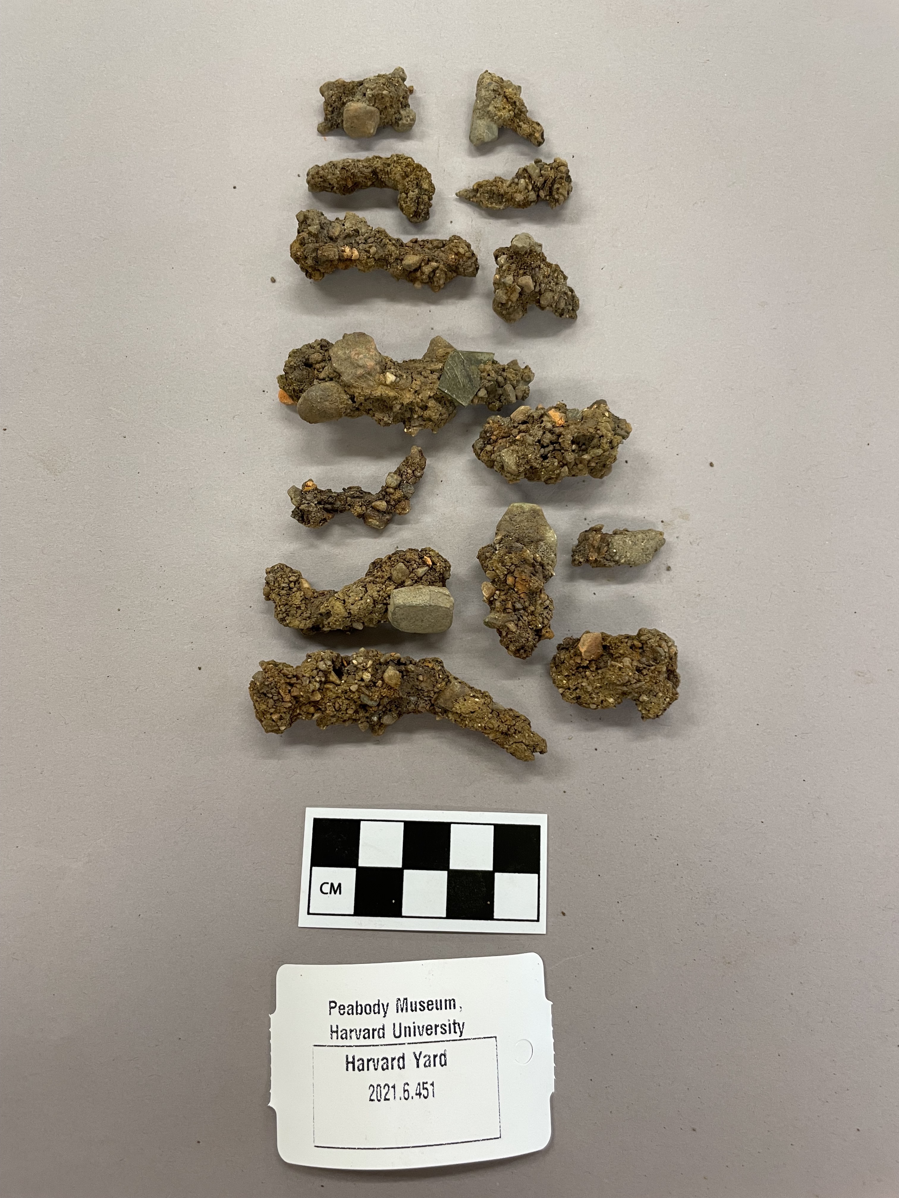 14 pieces of heavily rusted metal. 3 are straight nails. 3 are bent nails. 7 are unidentifiable, but could possible be part of nails.