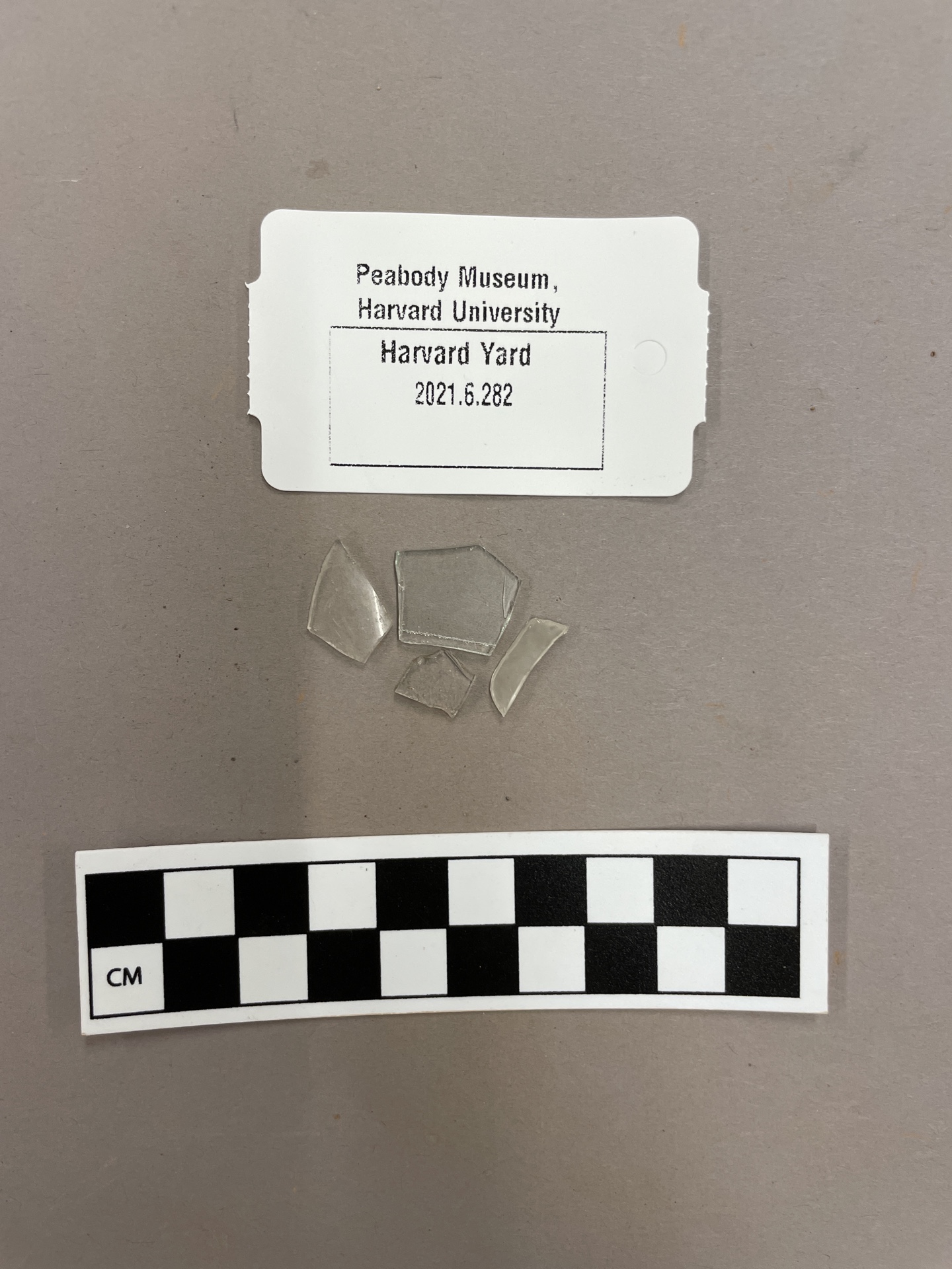 4 colorless flat glass fragments that were used as window glass. One has a flat etched line .1cm from the edge. One is frosted.
