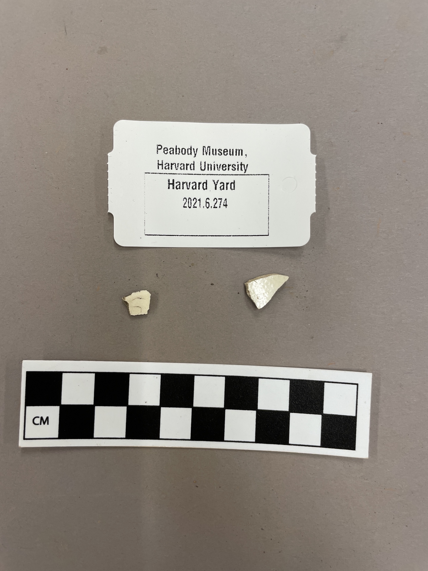 2 sherds of creamware. One with glaze on both sides and one with glaze on one side.