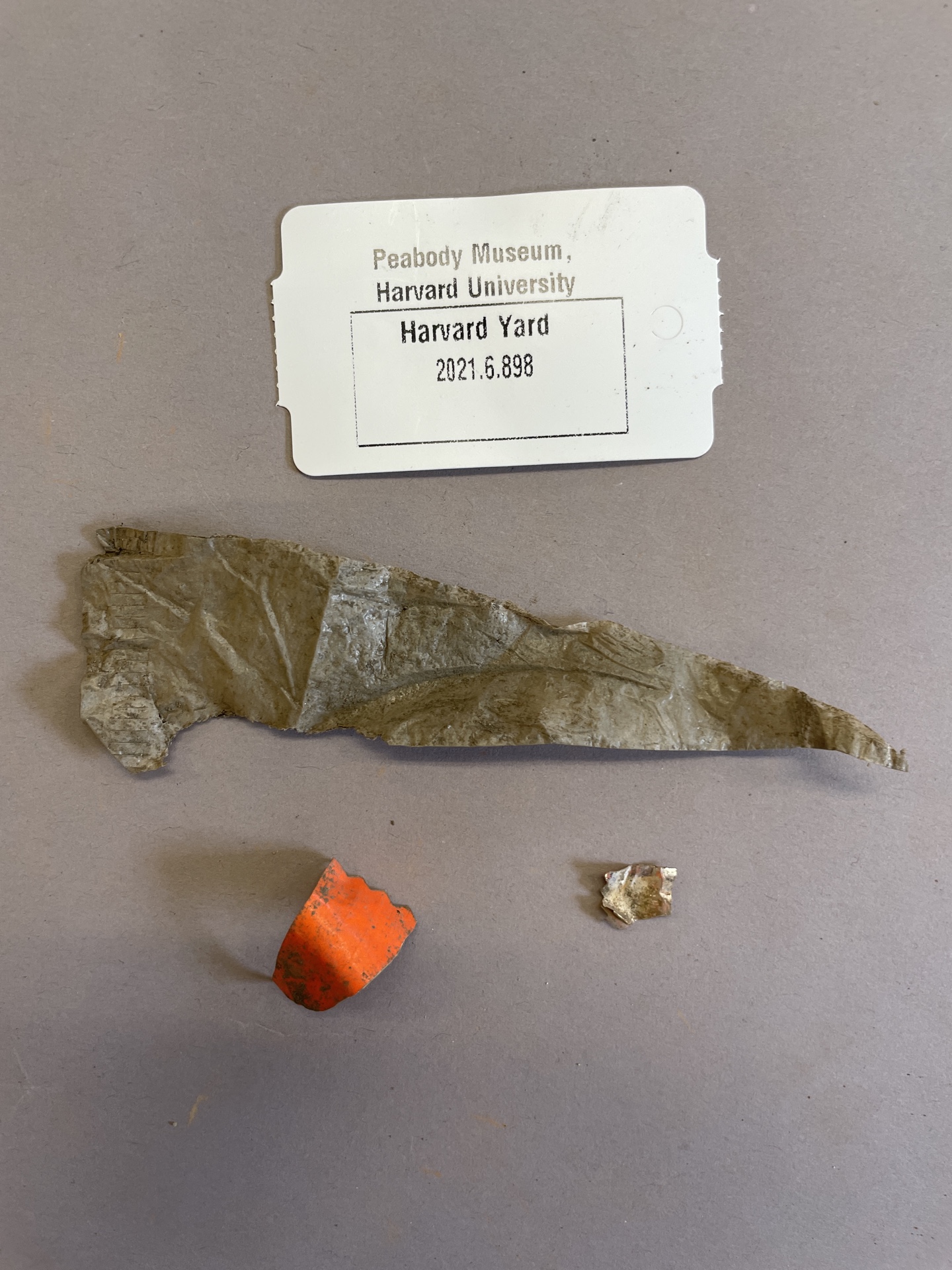 Two orange plastic flag pieces and one clear plastic tarp piece.