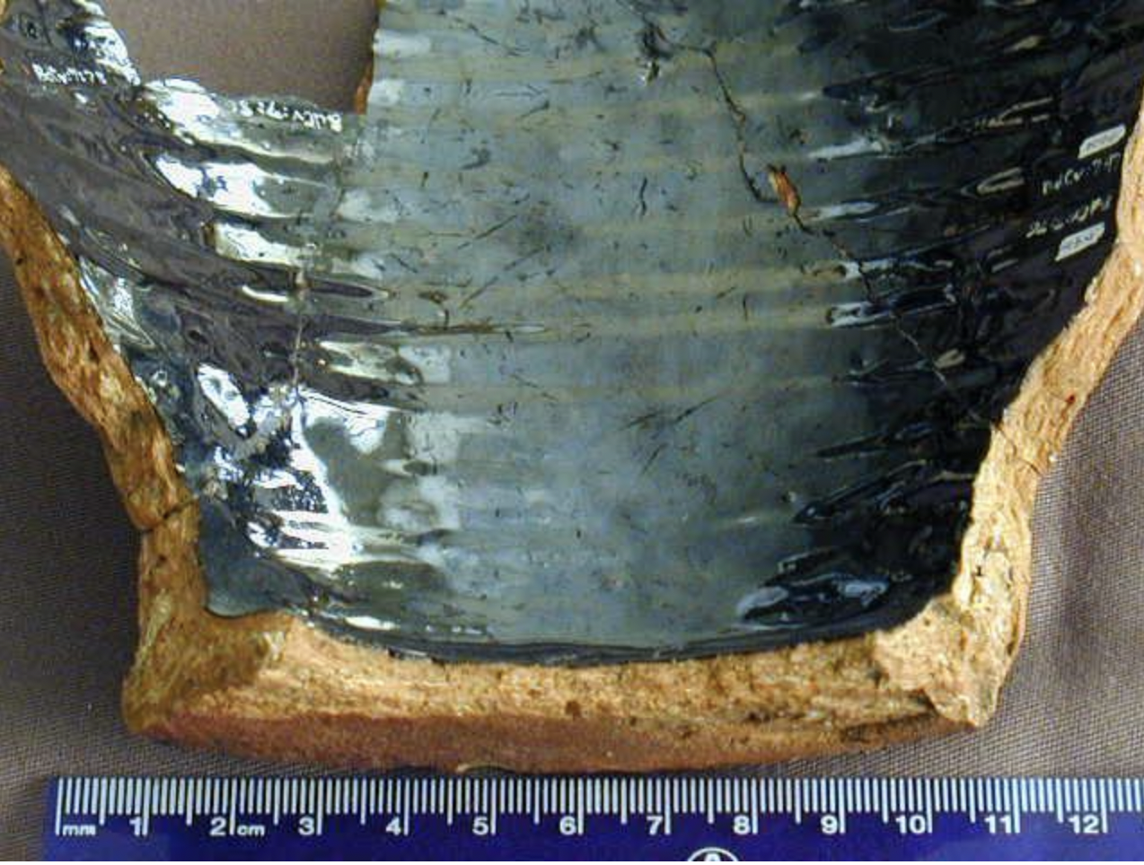 In the mid 18th century, the Buckley district potters of North Wales were hard at work creating ceramic vessels - creampans, storage jars, and pitchers - to be shipped across the Atlantic for use in the New World. This unique artifact type is readily identifiable by its pink-firing and yellow clays, which are believed to have been combined to make the clay more workable (JPPM, Noël Hume 2001). It is most often found with the black lead-glaze interior coating seen here. On complete Buckley-type ceramics, there is often a thick ribbing around the body accompanied by a prominent, angular rim (SMU). This type of ceramic saw continuous shipment from Wales to the Colonies from approximately 1720-1775; its end coinciding with the beginnings of the American Revolution (Noël Hume 2001).