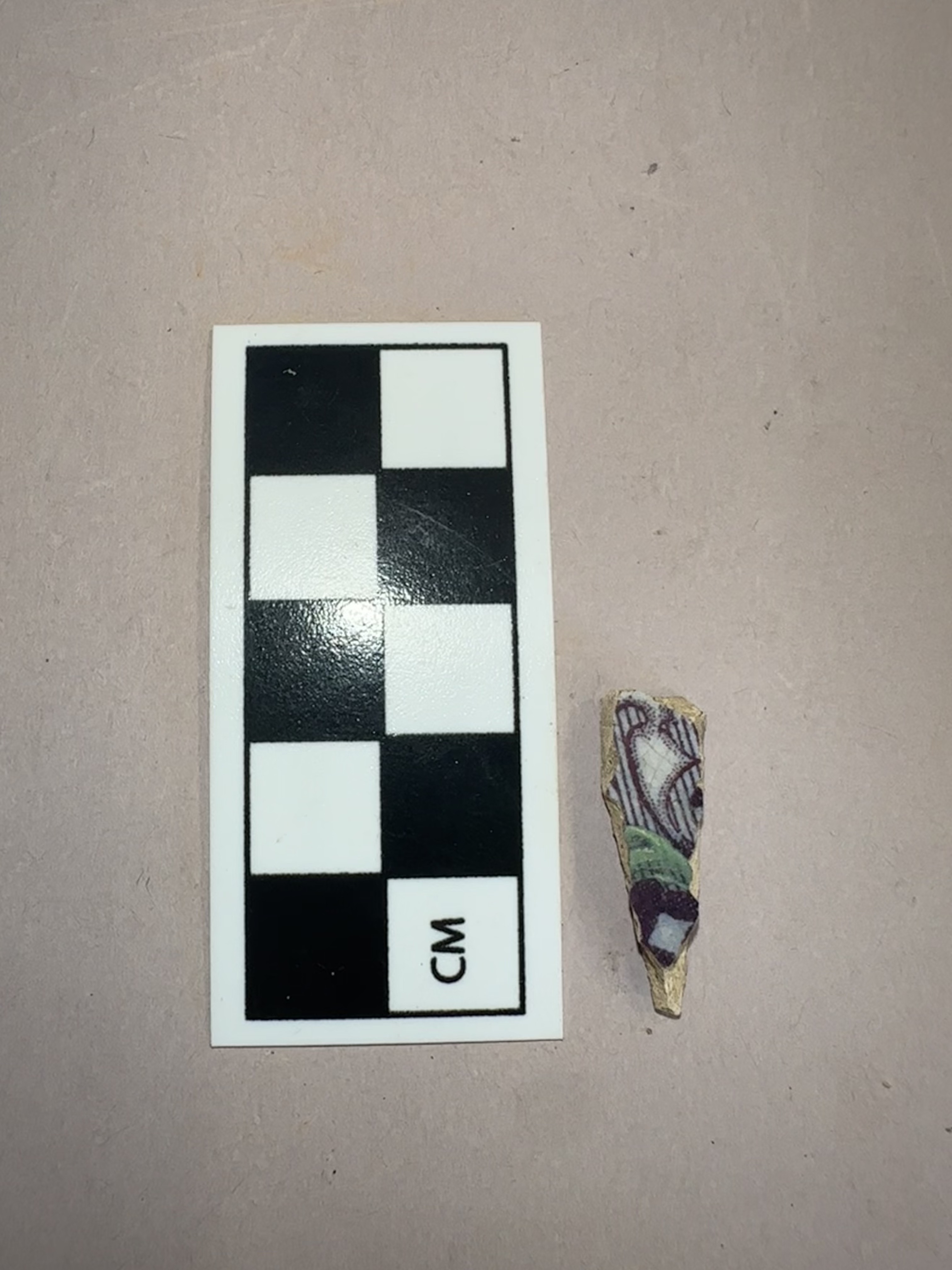 purple and green transfer print decorated, refined earthenware fragment from an unidentified vessel