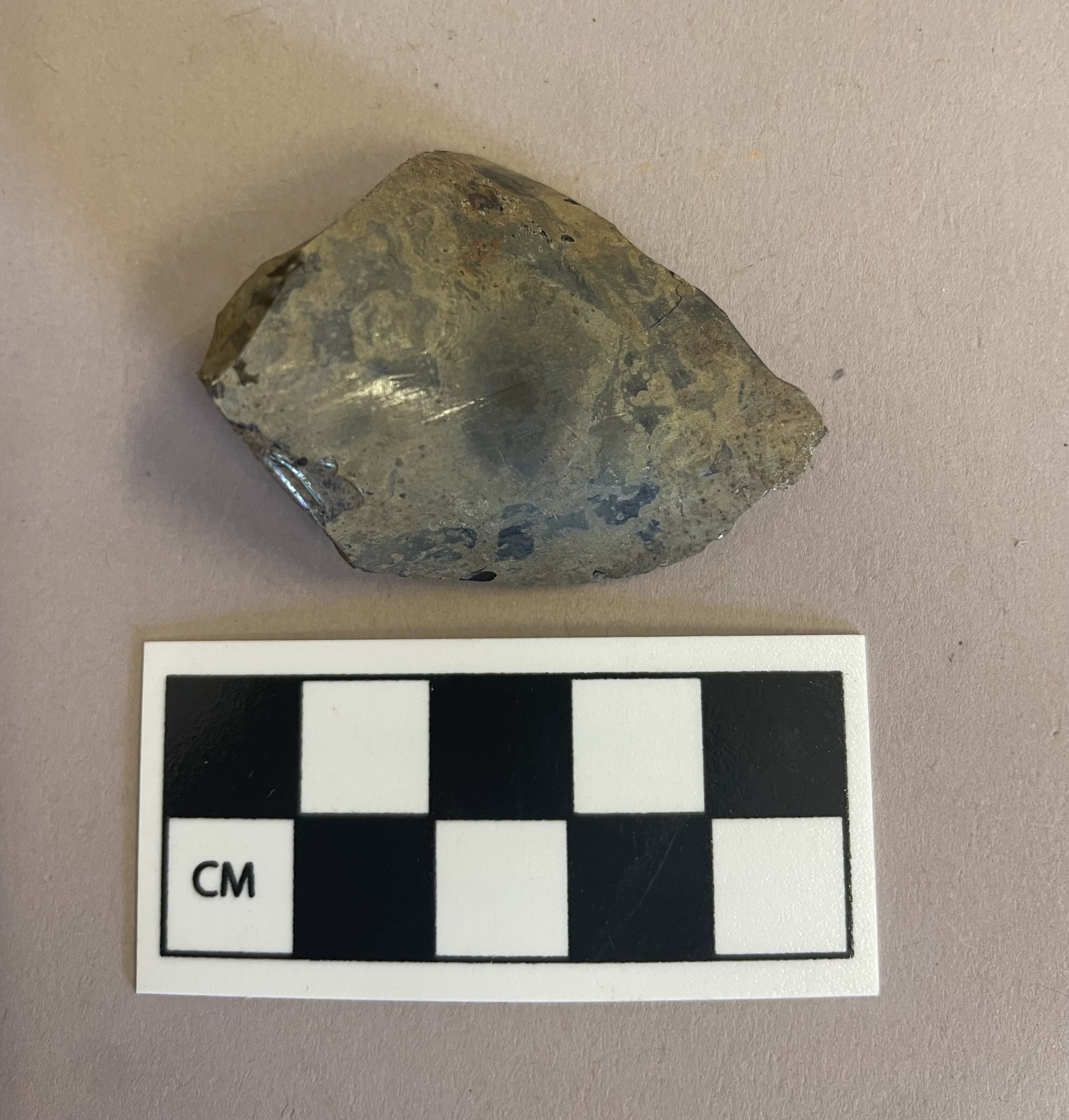 This fragment of olive green bottle glass was found in Level 2 of Unit H978, along the south wall of Holden Chapel in Harvard Yard. Given its patinated surface and overall thickness, this shard likely originated from a wine bottle, specifically the neck area. A visual guide compiled by Ivor Nöel Hume documents the transition from the round, onion-shaped wine bottles of the 17th century to the more slender wine bottles of the 18th century. Since this fragment has a straight vertical edge, it best matches the examples from the latter century. Drinking was quite common at Harvard Yard during this time, as students began shirking restraints from the Puritan era. Faculty records from President Benjamin Wadsworth’s tenure (1725-1737) contained many instances of “drinking frolicks,” and alcoholic drinks were even concocted within Harvard Yard in the following decades (Morison, 1964). The condition of this glass fragment is further significant, as the crust on its surface points to weathering processes over time. Indeed, the partly-dulled yet partly-iridescent surface is largely a result of ions that leached out of the fragment due to moisture within the soil, as noted by the Corning Museum of Glass. Given these visual and historical cues, this bottle fragment in Harvard Yard can thus be linked to the 18th century.