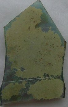 A shard of olive-colored glass with patina on surface, likely from the neck of an 18th century wine bottle.